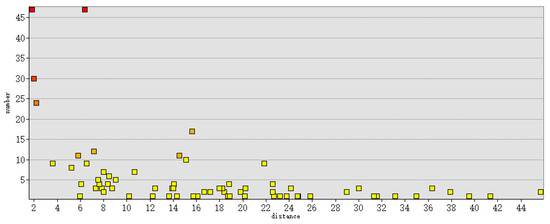 Figure 10 shows the number of connection trajectories corresponding to different distances between scenic spots. From the distribution shown in the graph, the distance between scenic spots can be divided into four levels: (0–8), (8–16), (16–24), and (24–+∞), in kilometers. From the graph, it can be seen that when the distance between scenic spots is less than 8 km, there are more connecting trajectories between them, with some scenic spots having more than 45 connecting trajectories. When the connection distance is between 8 and 16 km, the number of connection trajectories approaches 20. When the distance is between 16 and 24 km, the number of connection trajectories approaches 10. When the distance is greater than 24 km, the number of connection trajectories is relatively small, usually less than five.