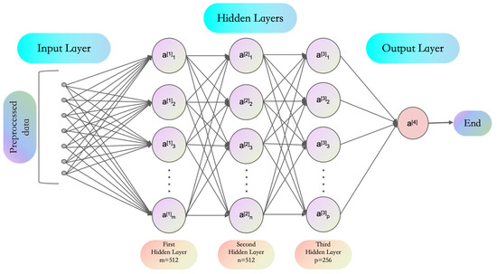 The multi-layer perceptron (MLP) serves as a feedforward neural network primarily used for handling simple to moderately complex data problems [31]. The MLP model structure used in this study is shown in Figure 1: it includes an input layer, the first and second hidden layers with 512 neurons each, the third hidden layer with 256 neurons, and an output layer with 10 neurons. The model was trained with 128 batches and 12 epochs, with a total network parameter count of 398,186. This structure is suitable for training and testing as a large-scale simulation, with a simple weight initialization procedure facilitating result comparison and analysis.
