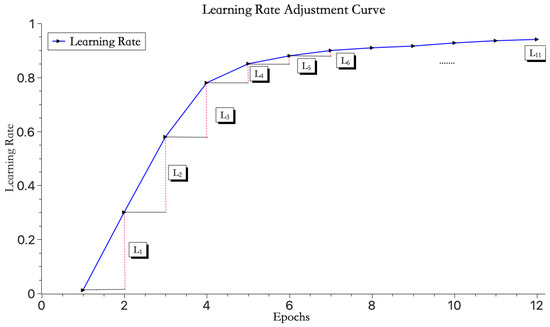 As indicated by Equation (11), when the maximum number of iterations N increases indefinitely, the coefficient multiplied by in Equation (11) will approach 1, meaning that the growth rate of the learning rate will approach zero. Before reaching this state, the desired learning rate effect will have already been achieved. Therefore, this method can still function effectively even when the number of iterations is not fixed.