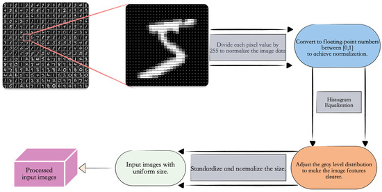 First, the MNIST handwritten digit dataset was loaded, and each pixel value of the images was divided by 255 to convert the image data type to a more efficiently processed floating-point type, achieving normalization. This helps the model converge faster and improves its performance. Second, histogram equalization was applied to adjust the grayscale distribution of the images, making the grayscale distribution of the output images more uniform, thereby extracting clearer image features. Finally, the images were standardized in size, adjusting all images to the same dimensions to ensure uniform input sizes for the neural network, as shown in Figure 4.