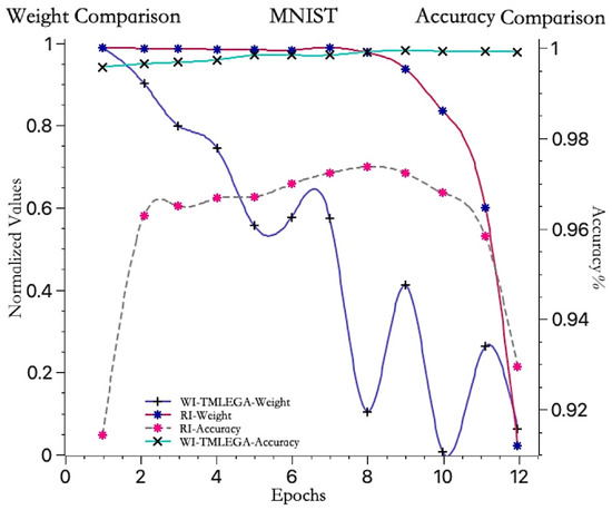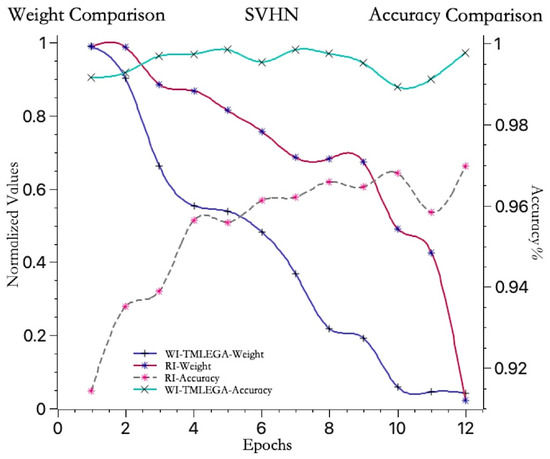 As shown in Figure 7, to further clarify the performance of the WI-TMLEGA method on different datasets, this paper compares it with the MNIST dataset using the USPS [33] and SVHN [34] datasets. First, the USPS and SVHN datasets were obtained from public sources and processed as described in Section 4.2. The USPS and SVHN datasets were then divided into training and test sets according to the same proportions as the MNIST dataset. Subsequently, the models using the USPS and SVHN datasets were initialized with both RI and WI-TMLEGA methods, and their performance was evaluated. The model architecture, number of training epochs, and parameters remained unchanged. According to the results presented in Figure 7, the WI-TMLEGA method demonstrates varying degrees of performance improvement over the RI initialization method across different datasets.