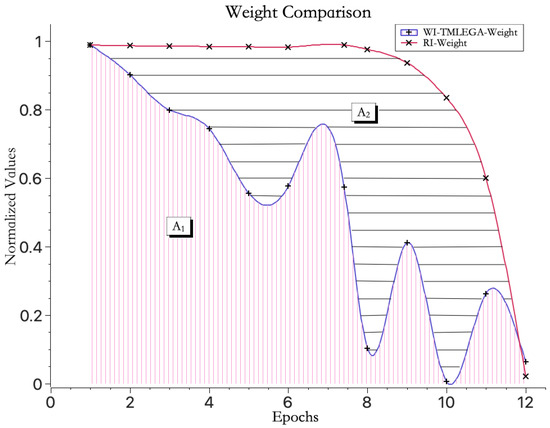 Area under the weight convergence speed curve. “” represents the area enclosed by the weight mean convergence curve and the horizontal axis when using the WI-TMLEGA method for weight initialization. “” represents the area enclosed by the weight mean convergence curve using the RI method for weight initialization and the curve using the WI-TMLEGA method, which indicates the improved convergence efficiency provided by the WI-TMLEGA method.