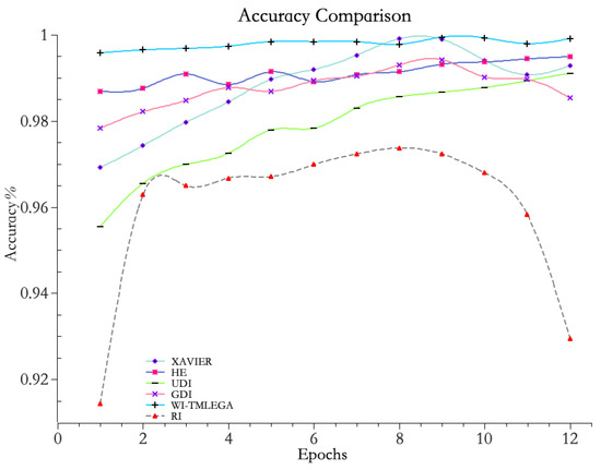 Comparison between WI-TMLEGA method and other initialization methods. The accuracy of the model was assessed using five common initialization methods. A larger value indicates higher accuracy.
