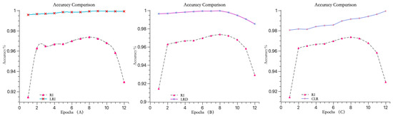 Comparison of three learning rate change strategies. (A) The accuracy curve of the model using a learning rate increment function steadily rises between 0.95 and 1. (B) The accuracy curve of the model using a learning rate decrement function gradually decreases to around 0.98 after the seventh iteration. (C) The accuracy curve of the model using a fixed learning rate function, although steadily increasing throughout, starts with an initial accuracy of only 0.98. Through a comparison using the same dataset, it is evident that the model using a learning rate increment function can effectively improve accuracy.