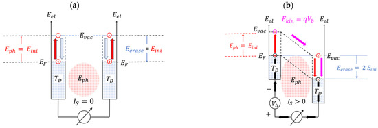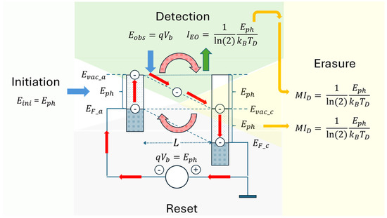 - After energy dissipation and spatial dispersion have taken place, the intermittently generated information has been removed from the PID device and has been distributed in the wider environment of the PID and, thus, been erased. In terms of energy consumption, this erasure has been performed at the expense of transferring two units of the Landauer minimum energy bound of per bit from the PID and towards the thermal reservoir in which the PID had been embedded. In the final step of reset, additional energy needs to be supplied from external resources to reset the instrument for a new round of photon detection. In cases where this final step is associated with an additional entropy production, the total energy cost for erasure and reset exceeds the Landauer minimum energy cost of two units of