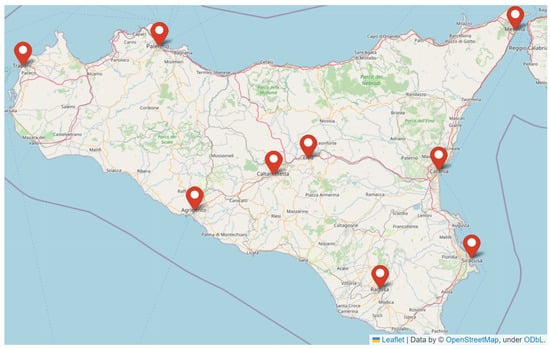 This study is based on precipitation records from 2002 to 2023 provided by a robust and extensive rain gauge network under the maintenance of the Sicilian Agrometeorological Informative System (SIAS), which comprises 107 meteorological stations. We included in our study the rain gauges of Messina, Catania, Siracusa, Ragusa, Agrigento, Trapani, and Palermo, which are the most populated cities on the coastline (Istat—Statistical National Insitute—report 2018/2019). In order to include the midland area, we added two more cities, namely Enna and Caltanissetta. We analyzed precipitation time series with a 10 min basis across the nine selected rain gauge stations, see Figure 1. The minimum quantity observable with the SIAS’s pluviometers was mm and, as we mentioned, the time resolution was 10 min; we used such granular data per station and built a new time series based on rainfall events.