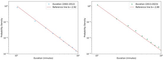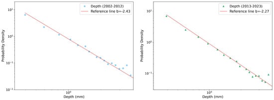 Due to the extensive number of reports generated for each season, variable, and decade, we present only a few selected plots, then we can summarize all the results in a more compact way. Figure 2, Figure 3 and Figure 4 illustrate PDFs of the events’ rainfall depth, maximum record, and duration, respectively, cumulated over all the gauge stations for the autumn season in each of the two decades, 2002–2012 (left panel) and 2013–2023 (right panel). All the distributions can be well fitted by power-law functions . Performing a test, the power-law fit always resulted in a p-value < 0.05, indicating the scale-invariant nature of the precipitation data, but with different slopes (reported in the legends).