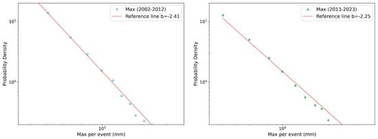 Probability density function of autumn max per event in log–log scale and the fit with a power law (red line) for the two decades considered: 2002–2012 (left panel) and 2013–2023 (right panel). The slopes of the fits are also reported, see text for more details.