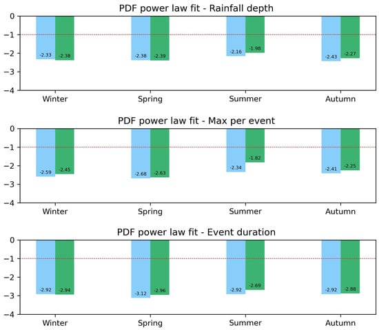 In Figure 5, we compare, as bar charts, the slopes of all the power-law fits performed on the seasonal distributions of the same three variables for the two considered decades. Bars are colored in blue for 2002–2012 and in green for 2013–2023. The analysis of rainfall depth and maximum record (top and central panel, respectively) revealed a sensitive increase in extreme events, indicated by a lower absolute value of the slopes, only for summer and autumn of the second decade. A slight increase in the events’ duration for the second decade can also be appreciated (bottom panel), but only for spring and summer. The winter behavior remained largely unchanged from one decade to another, even if a small decrease in rainfall depth together with a slight increase in the max intensity are visible for this season (in the top and central panels, respectively).