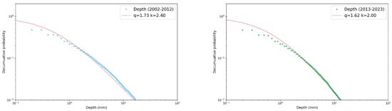 Decumulative probability distributions in log–log scale of winter rainfall depth per event and their q-exponential fits. Comparison between decades: 2002–2012 (left panel) and 2013–2023 (right panel).