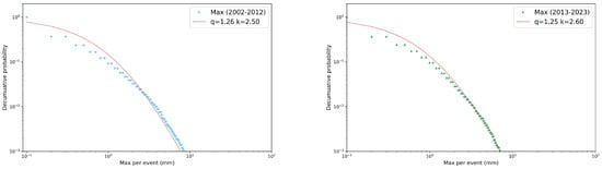 Decumulative probability distributions in log–log scale of winter maximum per event and their q-exponential fits. Comparison between decades: 2002–2012 (left panel) and 2013–2023 (right panel).