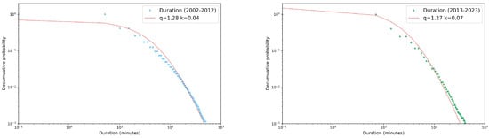 Decumulative probability distributions in log–log scale of winter event duration and their q-exponential fits. Comparison between decades: 2002–2012 (left panel) and 2013–2023 (right panel).