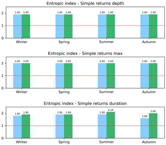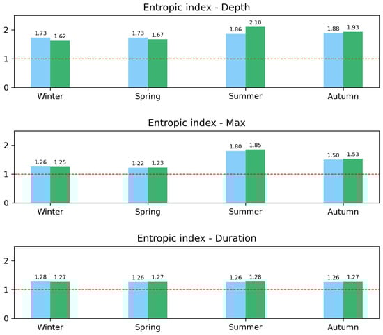 Detailed results of the values of the entropic index q for each variable and each season are reported in the three panels of Figure 9, where bar charts are again colored in blue and green for 2002–2012 and 2013–2023, respectively.