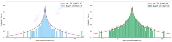 Simple returns in log–lin scale: data and q-Gaussian fits of spring events’ rainfall depth. The comparison between the two considered decades, i.e., 2002–2012 (left panel) and 2013–2023 (right panel), does not show any relevant differences in the entropic index q.