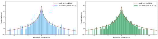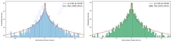 Simple returns in log–lin scale: data and q-Gaussian fits of winter maximum per event. In the left panel, we report the 2002–2012 decade, while the right panel shows the 2013–2023 decade. See text for more details.
