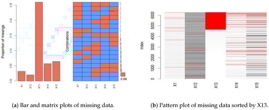 A bar plot, matrix plot, and pattern plot of missing data are shown in Figure 1, which visually represents the distribution of missing data across various features in our dataset [,]. Given the extensive number of features in our dataset, we carefully selected five representative features to illustrate the missing data patterns, thus avoiding overly complex visualizations. The selected features provide a clear view of the missingness across the dataset without compromising the understanding of its structure. As shown in Figure 1, the bar plot and matrix plot indicate the proportion and interrelationships of missing data across features. From the bar and matrix plots of missing data, it is observable that the proportion of missingness across each feature exhibits no discernible pattern, suggesting that the missing data are missing completely at random (MCAR). The right side of Figure 1 showcases a missing data pattern plot sorted by feature X13 to examine potential correlations and patterns among features. In this plot, there exist overlapping red areas between features X14 and X15, suggesting that instances of missing data in these features frequently coincide. The co-occurrence of missing values in these features suggests that their missingness is influenced by the observed values in other features. This pattern aligns with a missing at random (MAR) assumption. Overall, the observed patterns indicate a mix of MCAR and MAR mechanisms. According to Stekhoven and Bühlmann [], random forest imputation is proven to be effective for MCAR and MAR data, providing high accuracy and maintaining data integrity without introducing bias. It does not require any assumptions and specific data types [,]. In this work, we employ the missRanger R package (R version 4.3.2), an efficient implementation of random forest imputation. This method iteratively builds random forest models to impute missing data by learning from observed patterns in the dataset []. By leveraging missRanger, we capitalize on its advantages of enhanced speed and robustness, significantly improving the handling of missing data in our analyses.