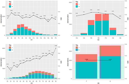 We study the association between patient discharge status and the main baseline features, including weight (X1), height (X2), age (X3), and gender (X8). To provide a preliminary exploration of potential patterns in our data, we present the results of the descriptive statistical analysis in Figure 2. The subfigure for weight shows that the proportion of in-hospital mortality approximately hovers around 0.3, without significant variation. Similarly, the height analysis reveals a generally stable mortality rate across most heights, with some deviations at extreme values. The age analysis indicates a clear trend where in-hospital mortality increases with age, reflecting a higher risk among older patients. Lastly, the gender comparison reveals minimal differences in mortality rates, suggesting a negligible impact of gender on discharge outcomes.