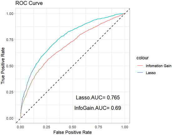 The ROC curves and corresponding AUC values are shown in Figure 3. The values of the average accuracy and AUC are shown in Table 7. We can see that the Lasso method has the largest average accuracy and AUC values. Therefore, we conclude that the Lasso penalized logistic regression performs better than the information gain method.