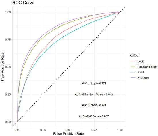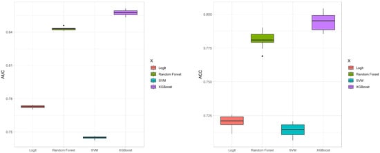 We conduct 10 iterations of 10-fold cross-validation to evaluate the four methods, focusing on their average AUC and ACC values. These results are illustrated in the box plots shown in Figure 4. The box plot for the AUC values indicates that XGBoost and random forest significantly outperform SVM and Logit in terms of predictive accuracy. Moreover, the variability among the four methods is relatively small. In terms of ACC values, XGBoost provides the highest mean accuracy. The ROC curves for the four methods are depicted in Figure 5, showing that the curves of XGBoost and random forest generally surpass those of the other methods. Also, the curve of XGBoost is slightly higher than that of random forest, which indicates its overall highest AUC value.