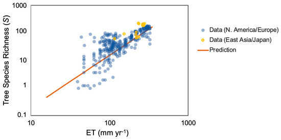 57]: “Predictable global patterns in species richness at the macro-scale can be accounted for by a simple climate model, based not on actual evapotranspiration (AET), which is an ambiguous variable, but on potential evapotranspiration (PET) and annual rainfall […] Historical contingency provides an important part of the explanation for residual variation, left over when climate has been accounted for.” We now check whether our results can help with the analysis of the role of historical contingency in the distinction between Asian and North American tree species richness.