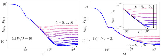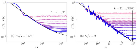 Dynamics of the survival probability (dashed lines) and particle imbalance (solid lines), see Equation (17), from the typical initial product states. Results are shown for (a) the 3D Anderson model at the critical point and for system sizes , and (b) the 1D Aubry–André model at the critical point and for system sizes 20, 30, 50, 100, 200, 250, 300, 400, 500, 750, 1000, 1250, 2500, 5000, 10,000, 20,000, 30,000. The black dashed line is a fit to the function , where is the infinite-time value of in the thermodynamic limit, which is non-zero (zero) in the case of the 3D Anderson model (1D Aubry–André model) due to the existence (absence) of the mobility edge, see also [20,21].