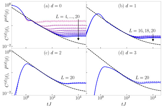 Dynamics of the survival and transition probabilities (dashed lines) and the corresponding generalized imbalance (solid lines), see Equation (21), from the typical initial product states. Results are shown for the 3D Anderson model at the critical point for (a) and , (b) and , (c) and , and (d) and . The black dashed line is a fit to the function , where is the infinite-time value in the thermodynamic limit.