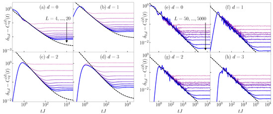 Based on the discussion above, in Figure 6, we plot at and at , i.e., we plot instead of that can become negative. Intriguingly, we observe qualitatively similar time evolution profiles as for the survival and transition probabilities. The correlation function exhibits a power-law decay that is qualitatively similar to the decay of the survival probability, compare Figure 6a to Figure 4a and Figure 6e to Figure 5a. In the case of the 3D Anderson model, decays towards a positive constant in the infinite system size limit, see Figure 6a, similarly to the decay of the survival probability to a non-zero constant . The correlation functions at exhibit a maximum after which a power-law decay sets in, which is qualitatively similar to the behavior of the transition probabilities, compare Figure 6b–d to Figure 4b–d and Figure 6f–h to Figure 5b–d. A closer inspection, however, reveals that the slopes of the decay of the equal-time connected density–density correlation functions are larger than in the case of the survival and transition probabilities; hence, in contrast to the results in Section 3 and Section 4, a quantitative similarity does not emerge.