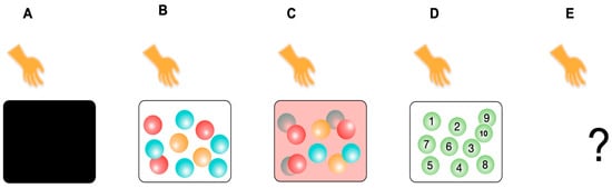 Let us illustrate how the internal probability concept is involved in biological adaptation using a series of thought experiments (A to E). In Experiment A to D, a person draws one ball from a box containing ten balls, observes the ball, returns it, and mixes it up. In Experiment E, conditions are hidden from us. The trial was repeated (n trials). Here, the person is a player and simultaneously an observer (internal observer), an LS that performs semiotic cognition in these experiments. The balls and box represent non-living cognizers who change their states through physical or chemical cognitions (Figure 2).