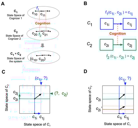 The CS model extends the concept of cognition to physical and chemical levels. “Cognition” is the determination of a succeeding state in relation to external states, which is a related state change that depends on other entities in the world. Cognition is contrasted with an “isolated state change” (Figure 1A). An isolated state change from xi to xj is represented as xi ⟼ xj (⟼ denotes a state change). A related state change (cognition) from state xi to xj occurs in response to the environment in state ei, denoted as fxi(xi, ei) = xj (Figure 1B), where the entity in state xi cognizes the environment in ei, changing to xj. Cognitions among entities create their relations by changing states in a context-dependent manner.