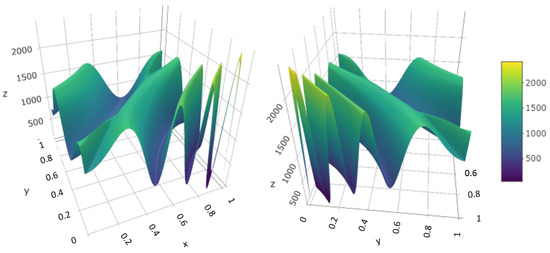 Figure 1 exhibits the intensity function generated by the deterministic expression (12). The anisotropy assumption is likely to be more adequate due to the varying level of oscillation of the intensity function as it gets close to the corners. The deformation should be significant and stretch the original space in the direction of the highest oscillation.