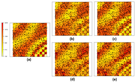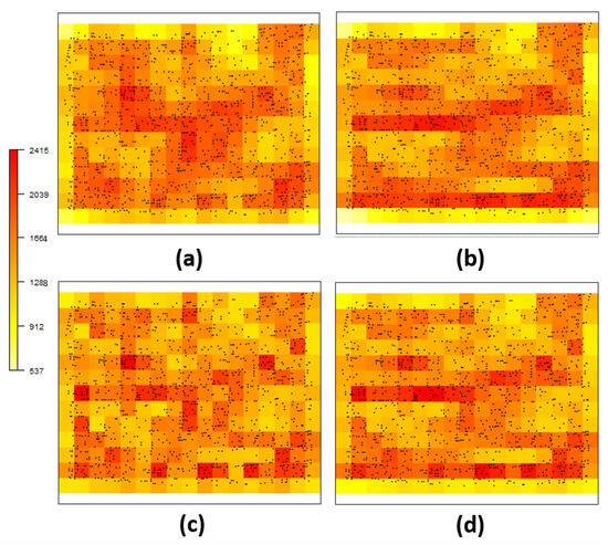The analyses presented in this section concern a real data experiment on the effects of a pest over a corn plantation. The data collection was carried out in an agricultural commercial area of 27 ha located in the city of Cascavel, Paraná state, Brazil (approx. 24.95° S, 53.57° W and 650 m asl). An occurrence is defined by the location of a plant of corn attacked with the fall armyworm in the experimental area during the crop year 2015/2016. The location is defined by the geographical coordinates of the infected plant, which were obtained using a GEOEXPLORE 3 GPS positioning system receiver in a Universal Transverse Mercator (UTM) coordinate system. The study area included 9360 corn plants, of which 1303 were infected by the S. frugiperda (Figure 7a). The dataset was provided by the Spatial Statistics Laboratory of Unioeste.