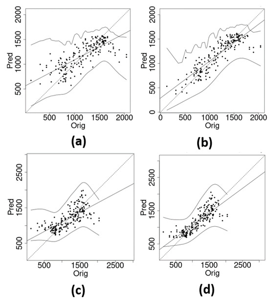 Further details of estimation of the intensity function (12). Scatter plot of true and estimated intensity function for different estimating scenarios: (a) intensity function not considering and (b) considering the deformation for probit link function, (c) intensity function not considering and (d) considering the deformation for log link function. The dots represent the pair of true and estimated intensity function values for all pixels. Full and dashed lines represent the identity and the exploratory regression lines, respectively. The latter is obtained by performing the fit of the estimated values based on the assumed true values as a covariate.