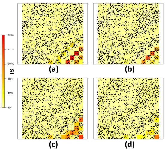 Intensity function estimation with DP showed similar behavior for both link functions, as shown in Figure 8 (items (b) and (d)). Bands appeared near the horizontal direction, showing similarity in higher or lower intensity values. When stationarity/isotropy was assumed and DP was not used (items (a) and (c) in Figure 8), the intensity function appeared less smooth, lacking clear intensity bands horizontally.
