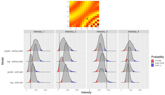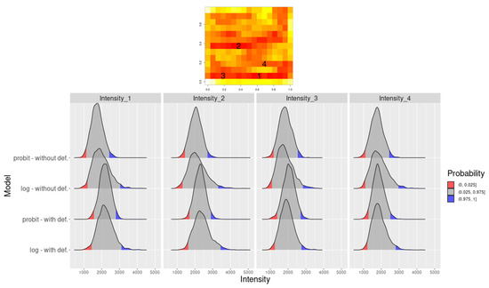 In order to avoid confusion due to the differences between hyperparameters associated with different link functions, and since results show an overall superior performance of the model with probit link, further results from Figure 6 present more details for the probit link only. Greater deformation from the original grid (near and ) resulted in higher SD variability. Our approach is fully Bayesian and Table 2 displays mean values and credibility intervals for hyperparameters that are estimated through the Hamiltonian Monte Carlo algorithm described in Appendix A.