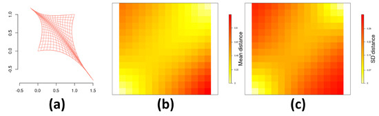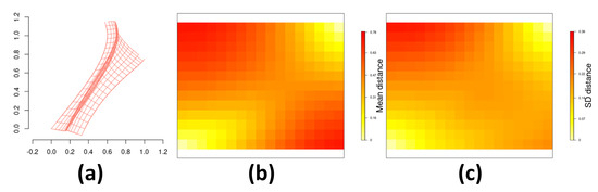 Estimation of the deformation d: (a) estimated mean deformation for the probit link function; (b) mean and (c) standard deviation for the posterior distribution of the distance between each centroid and for for the probit link function.