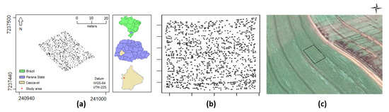 Point pattern for the corn plants infected by the S. frugiperda with (a) original and (b) rotated latitude and longitude and (c) a satellite image of the experimental area with the polygon of the study area. Adapted from Nava et al. [37].