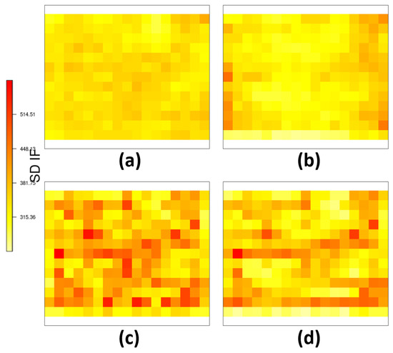 Standard deviation for the intensity function for the model for the Spodoptera frugiperda pest data: (a) not considering and (b) considering the deformation for probit link function, (c) not considering and (d) considering the deformation for log link function.