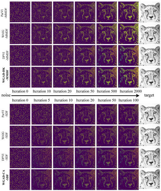 - Accelerated position update. By considering the second-order information of the Wasserstein probability space, different accelerated position update strategies have been proposed [27,32]: Liu et al. [27] follows the accelerated gradient descent methods in the Wasserstein probability space [34,35] and derives the Wasserstein Nesterov’s (WNES) and Wasserstein Accelerated Gradient (WAG) methods, which update the particles’ positions with an extra momentum. Inspired by the Accelerated Flow on the space [36], the Accelerated Flow (ACCEL) method [32] directly discretizes the Hamiltonian gradient flow in the Wasserstein space and updates the position with the damped velocity field, effectively decreasing the Hamiltonian potential of the particle system. Later, Wang and Li [33] considered the accelerated gradient flow for general information probability spaces [37], and derived novel accelerated position update strategies according to the Kalman–Wasserstein/Stein Hamiltonian flow. Following similar analyses as in [36], they theoretically show that, under mild conditions, the Hamiltonian flow usually converges to the equilibrium faster compared with the original first-order counterpart, aligning with the Nesterov acceleration framework [38]. Numerous experimental studies demonstrate that these accelerated position-update strategies usually drift the particle system to the target distribution more efficiently [27,32,33,39].