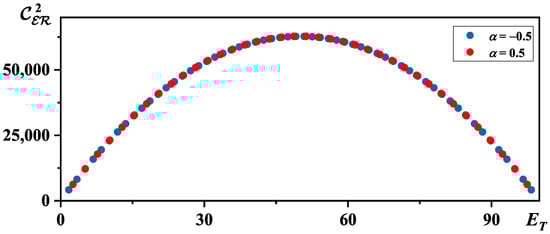 This is a typical concave downward parabola. That is, the correlation between emissions and the remainder of the black hole first increases and then decreases as the black hole radiation continues. Similar to the Page curve [,], the bipartite correlation reaches its maximum when the black hole evaporates halfway ( M). It is worth noting that the above discussions are based on the stable black hole, which means that the antiparticle has entered the black hole for a long time, and the entanglement between the particle and the antiparticle has been removed due to the annihilation between the negative particle and the matter in the black hole. Therefore, we calculate the correlation and entropy long after the annihilation in the black hole. In addition, we can rewrite Equation (8) as follows: