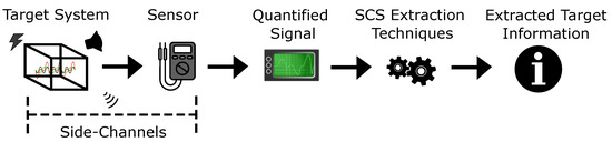 The SCS process involves the quantification by sensors of signals traversing unexpected indirect pathways (i.e., side channels) within target systems. Captured signals are analyzed via extraction techniques to acquire embedded target information (Figure 1) [1]. For instance, a HCI solution capturing hand gestures visually via a camera is too direct and ‘obvious’, whereas capture via acoustics [13] is less obvious and non-trivial (i.e., a side channel). A SCS framework applicable to and encompassing target systems from any domain does not currently exist. The HCI and Misc domains apply SCS, albeit implicitly, without formal methodologies and with each solution presented in isolation; conversely, the CYB domain explicitly recognises side-channels with formal methodologies. However, their developments are entirely siloed from each other [1,2]. Recent works formalised SCS within MDM and consolidated it with CYB [1]. This section analyses literature demonstrating the definition of SCS across these domains while isolating the target systems involved along with the utilised techniques and mindsets.