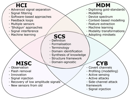 - The crux of our SCS research is that noise in a signal may actually contain meaningful content (i.e., target information), thereby qualifying as a candidate side channel. The lack of a unified SCS framework results in solutions using ad hoc sequences of features, filters, and other individually tuned signal processing stages. Adoption of mindsets from varying domains represents an opportunity to reveal novel SCS extraction techniques; for example, one may ‘attack’ the human body for MDM purposes similarly to how cyber–physical systems are exploited within CYB [1].