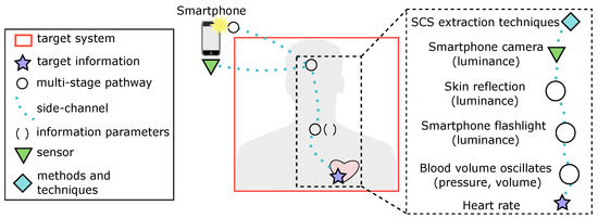 - Such properties provide insight into the side-channel signal’s structure and embedded target information. The multi-stage nature of side-channels means that side channels emanate and traverse from their source in a myriad of ways, during which time side-channels are mixed, transformed, and vary in modulation (Figure 2). Consequently, multiple side channels may be plausible for the same target information. MDM is an example, with the human body’s interconnected nature promoting an array of side channels. For example, a single instance of target information such as the heart rate is accessible by traditional gold standards (ECG, stethoscope) as well as by “less obvious” side channels: within the ear canal [78], via chest and head movement [79,80,81,82], photoplethysmography by a camera view of the ear canal [83] or face [30,31,74], or monitoring of chest oscillations via WiFi (e.g., electromagnetic radiation) [32].