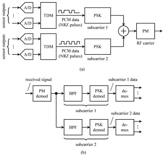 A block diagram of the corresponding ground station is shown in Figure 3b. The first step was to apply a coherent PM demodulator to the received signal. A coherent phase reference was extracted from the received signal as explained in the previous paragraph. Coherent PSK demodulators—comprising a matched filter (usually an integrate-and-dump operation), a carrier phase PLL, and a timing PLL—were applied to each subcarrier signal. The output bits were then de-multiplexed to access the data words for each sensor.