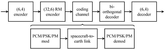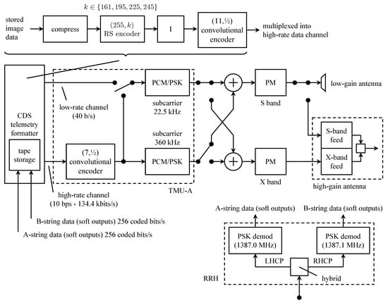 The telemetry system for the Viking orbiter is shown in Figure 9a. Uncoded engineering data, at a rate of or bits/s, was used to modulate the low-rate subcarrier using PCM/PSK [42]. Science data were transmitted on a high-rate subcarrier using PCM/PSK and could be coded or uncoded. The uncoded data rate was 1, 2, or 4 kbits/s and the coded data rate was 1, 2, 4, 8, or 16 kbits/s [42]. The code was the same (32,6) Reed–Muller code used for the Mariner program described in Section 3.2. The two subcarriers were frequency division multiplexed and the combination was used to phase-modulate an S-band carrier at 2300 MHz [43,44].
