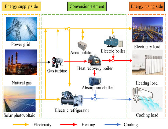 IES, as a new type of energy system, optimizes the whole process of energy production, transmission, storage and use. It can efficiently harness renewable energy sources, ensuring their optimal use. Additionally, it achieves gradient utilization of non-renewable energy sources, promoting the synergistic operation of various energy types. This approach enhances the overall energy utilization efficiency [37]. The schematic diagram of the system is shown in Figure 1. The electrical loads are provided by gas turbines, storage batteries, photovoltaic devices and external grids. The cooling load is provided by electric chillers and absorption chillers. The heating load is mainly provided by electric boilers and waste heat boilers.