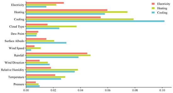 As can be seen from Table 1, the weight value of Cloud Type is as high as 0.423, indicating that the dispersion of data distribution of this indicator is enhanced, and thus contains more abundant information. The weights of Cooling, Heating, Surface Albedo, Relative Humidity, Rain, Wind Speed, Wind Direction, Temperature and Electricity are 0.1017, 0.0746, 0.0740, 0.0740, 0.0684, 0.0528, 0.0401, 0.0313 and 0.0278, respectively. The weights of Dew Point and Pressure are 0.0165 and 0.0158, respectively, indicating a low degree of variability in these two indicators.