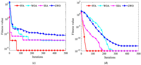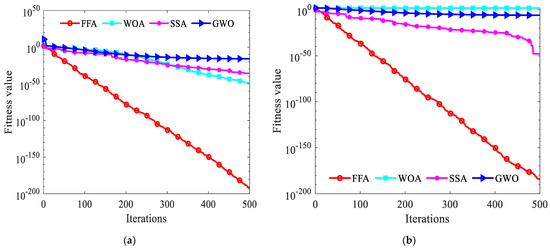 The pseudo-code of the specific implementation steps of the FFA algorithm is in Algorithm 1. So as to investigate the effectiveness of the FFA algorithm, this article compares the optimization results of this algorithm with the grey wolf optimizer algorithm (GWO) [40], whale optimization algorithm (WOA) [41] and sparrow search algorithm (SSA) [42], severally. The download address is https://seyedalimirjalili.com/projects (accessed on 15 January 2024). The quantity of populations and the maximum quantity of iterations for whole algorithms are considered as 30 and 500. The experiments are performed in MATLAB R2021a software using a 64-bit Core i5 processor with 2.50 GHz and 16 GB main memory in Windows 11.
