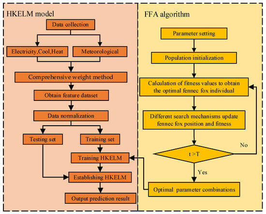 The precision of prediction for the HKELM model is determined by the mixed kernel parameters and penalty parameters , so it is particularly important to optimize these key parameters. Here, the FFA method is used for optimization, and the FFA-HKELM model is established to achieve the prediction of the electric cooling and heating loads. The whole framework procedure is as illustrated in Figure 6, and the specific process is the following.