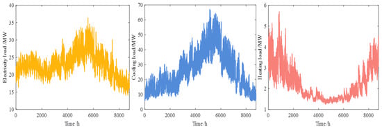 In the article, the measured values of the integrated energy system provided by the Tempe regional network platform of Arizona State University from 1 January to 31 December 2020 are used for the experiment [43]. The sampling period of the data is 1 h and contains a total of 8784 sample points, and the measured numerical values from 1 January to 26 December 2020 are trained to forecast electrical, heating and cooling loads from 27 December to 31 December 2020. The measured electrical, heating and cooling loads are different in dimensions, and these three loads need to be converted into a unified unit MW, where the unit relationship between different loads is 1 MW = 284 Ton = 3.4 MMBtu/h. Figure 7 shows the variations for the processed loads.