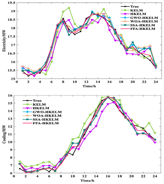 Compared with the predicted results of different optimization algorithms, the MAE and RMSE of the FFA-HKELM model for electric load reductions range from 0.1147 MW to 0.1603 MW and 0.1455 MW to 0.1918 MW. For the cooling loads, the MAE and RMSE reductions in the FFA-HKELM model range from 0.1047 MW to 0.1336 MW and 0.1461 MW to 0.1707 MW. For the heating load, the MAE and RMSE reductions in the FFA-HKELM model range from 0.0247 MW to 0.0282 MW and 0.0335 MW to 0.03995 MW. It can be seen that the FFA algorithm has the best optimization-seeking effect for the HKELM, which can readily optimize the key parameters and significantly promote the predictive performance of this model. It can be found that the proposed FFA-HKELM model has the best overall prediction effect and the smallest WMAPE value. Compared with the predicted results of other models, the WMAPE reduction in FFA-HKELM model ranges from 0.9262 MW to 2.8138 MW. The predictions of these models are shown in Figure 8.